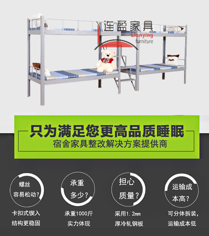 尤其是連盈家具的鋼制東莞員工上下床,長(zhǎng)期使用也不會(huì)生銹,因?yàn)槲覀兊乃嵯戳谆栏g工藝已經(jīng)很成熟了,在除銹防銹上也有充足的經(jīng)驗(yàn)。床體表面平滑不傷手,匠心噴漆技術(shù),不掉漆更固色,曾得到德國(guó)客戶(hù)的贊賞。連盈家具鋼制上下床,一床能用10年,床架子厚實(shí)牢固,不會(huì)像木床那樣易腐化。木床如果腐化就會(huì)加快換床的速度,這樣就會(huì)用上更多的樹(shù)木,站在環(huán)保的角度看,這也是不利于可持續(xù)發(fā)展的。