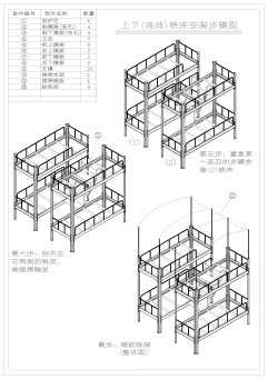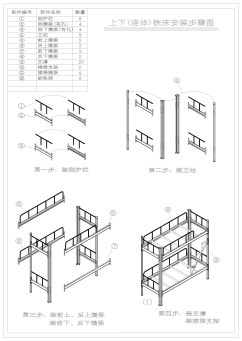 一個能讓學(xué)生靜下心來,安靜思考,安靜學(xué)習(xí)的環(huán)境,是需要配套的設(shè)備與設(shè)施。下面的是連盈家具學(xué)生上下鋪床的組裝圖紙,我們鐵床都是無螺絲卡式連接的,這樣就避免了由于螺絲不能牢固,而造成噪音;每個立柱上下都裝有一個避免鋼材直接與地面接觸的塑膠保護(hù)套,作用是避免鋼材直接與地面接觸,而造成不必要的損壞跟床架的固定性。
