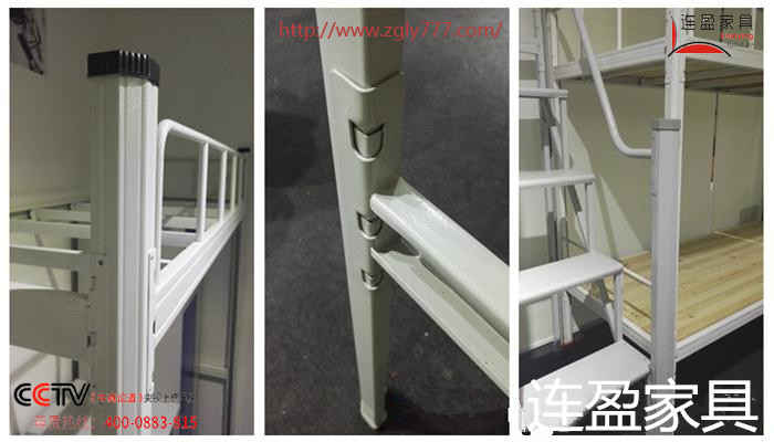連盈的廣東學生公寓床,由冷軋鋼生產制作而成。全卡扣式結構,靜音牢固。立柱和橫梁的立面為中空異形,有加強筋,材料厚度為1.2mm。護欄高度為220mm,樓梯表面需有凹凸紋路,可以起到防滑作用,確保安全。承重鋼材1.2mm厚,每張床的承重力可達400kg!鐵床采用的型材里外都做了酸洗磷化的防腐蝕處理, 即使在比較潮濕的地方也不易生銹。延長了床使用壽命,使用年限長達10年!
