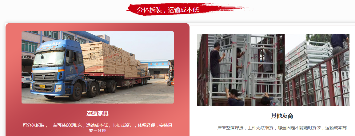 冷軋鋼組合公寓床與不銹鋼床的銜接與運輸對比更“慘烈”!冷軋鋼公寓床是使用卡扣式銜接,利用物理原理,受力越大越久,卡扣會卡的越緊。本公司的床架可以進行整體拆裝,節(jié)省物流運輸?shù)目臻g,也直接節(jié)約了運輸成本。不銹鋼床的銜接方式是焊接與螺絲相結(jié)合的方式,焊接口在技術(shù)不完善的情況下,會出現(xiàn)脫落的情況。在運輸上,整個床體不能自由拆裝,物流運輸占用空間大,如若出現(xiàn)使用期間變更場地,無法自由拆裝進行搬運。